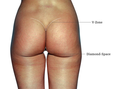Der innere Rand des großen Gesäßmuskels zieht nach unten und dann bogenförmig nach außen, und formt so die Gesäßfalte. Idealerweise teilt sich die Gesäßfalte bei 2/3 der Länge, zieht in 45° nach unten zum Oberschenkel und bildet gemeinsam mit der gegenüberliegenden Falte eine Raute, die in der Literatur als Diamond-Space bezeichnet wird.
