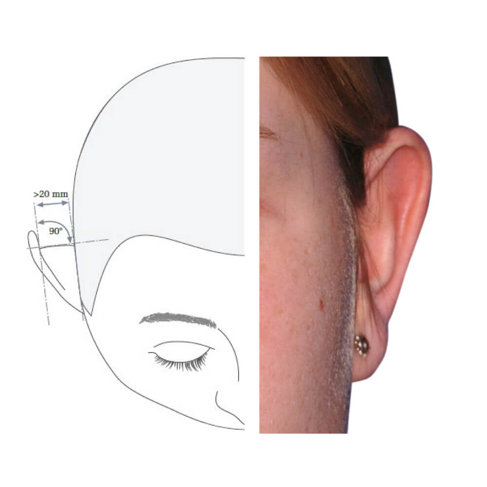 Man erkennt deutlich, wie breit die innere Ohrmuschel (concha) ist und dass die Helix normal (90°) nach hinten zieht